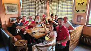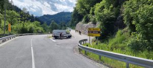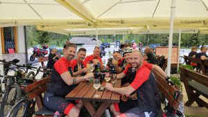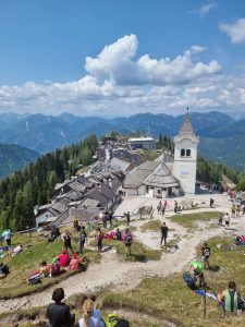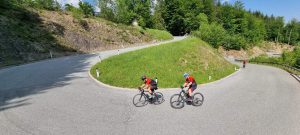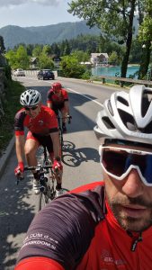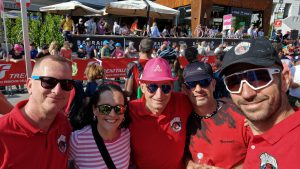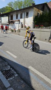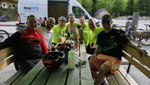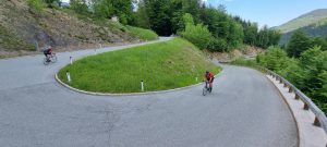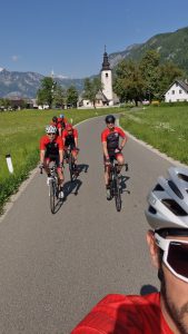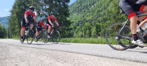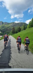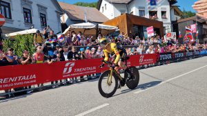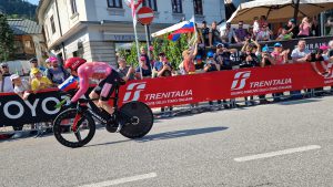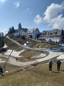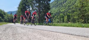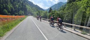 Tam smo se preoblekli, ter s spremljevalnimi vozili odpravili do Planice, od koder je vozil avtobus do Trbiža, kjer je bil štart predzadnje etape Giro d’Italia 2023, odločilnega gorskega kronometra na Višarje (Monte Lussari). Za nami je bilo 70km kolesarjenja in 1.240 višincev.