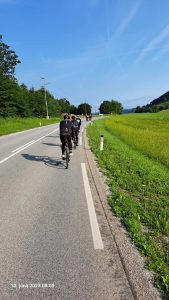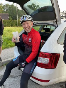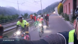 Petek, ob 22.40. Fantje smo izračunali, da bi povprečna hitrost morala biti okoli 27 km/h, postanki na dve uri po 5 minut, malo več postankov za zajtrk in kosilo, načrt skupinske vožnje in vožnja ponoči. Okrog 4. ure zjutraj smo prispeli v Zidani most, kjer nas je že čakala spremljevalna ekipa s hrano, kavo in pijačo. Nato nas je pot vodila po sevniškem in krškem koncu, na poti pri Kostanjevici na Krki, v mestecu Zameško, pa nas je čakalo pravo presenečenje – sodelavka Mirjam Trelc Ocepek je z možem za vse skuhala ovsene kosmiče s čokolado. Sredi noči! Iz nasmehov in komentarjev kolesarjev je bilo razvidno, da smo zadeli v polno, saj smo bili kot prerojeni, in pavza je prišla v pravem trenutku.